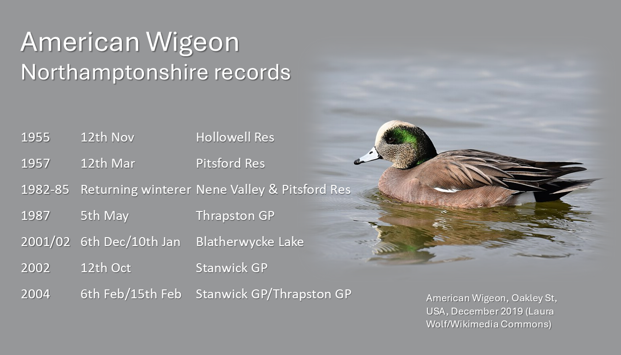 Discovered at Thrapston GP’s Titchmarsh NR on 27th and leaving all of the aforementioned in the shade, however, was Northamptonshire’s first American Wigeon for twenty-one years. Long overdue, it’s only the eighth county record and, remaining settled throughout the week, it duly attracted a steady stream of admirers, both local and from further afield.