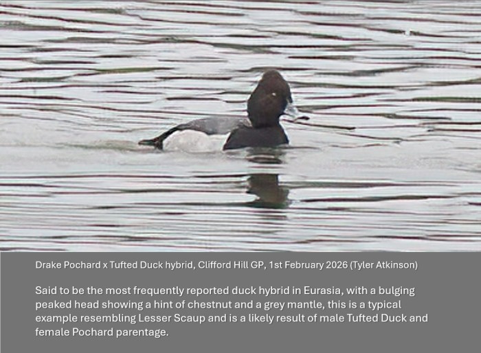 Very much a shining light in the dreary winter gloom, as well as being an easy ‘drive-up-and-see’, a drake Smew found at Ravensthorpe Res on 25th subsequently proved a popular pull throughout the following day but it was nowhere to be seen thereafter. This was not the case with the drake at Clifford Hill GP which, last seen on 5th Jan, was back there again and on view daily from 24th throughout the period.