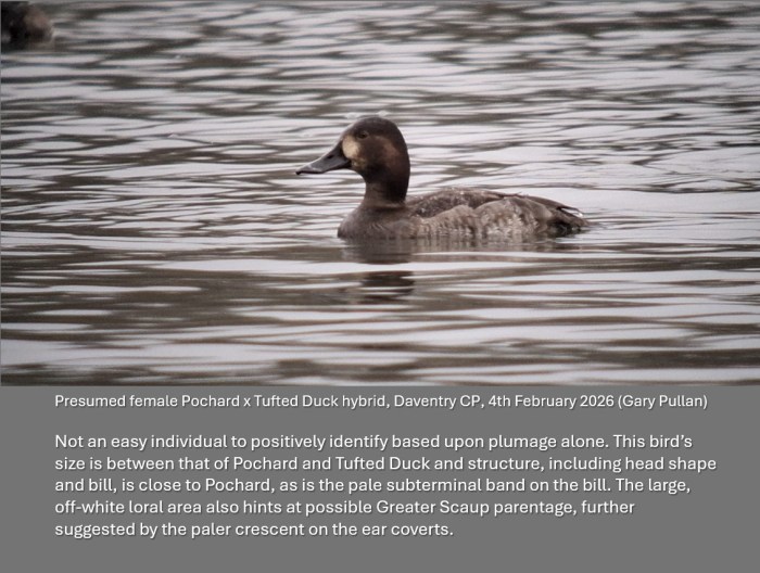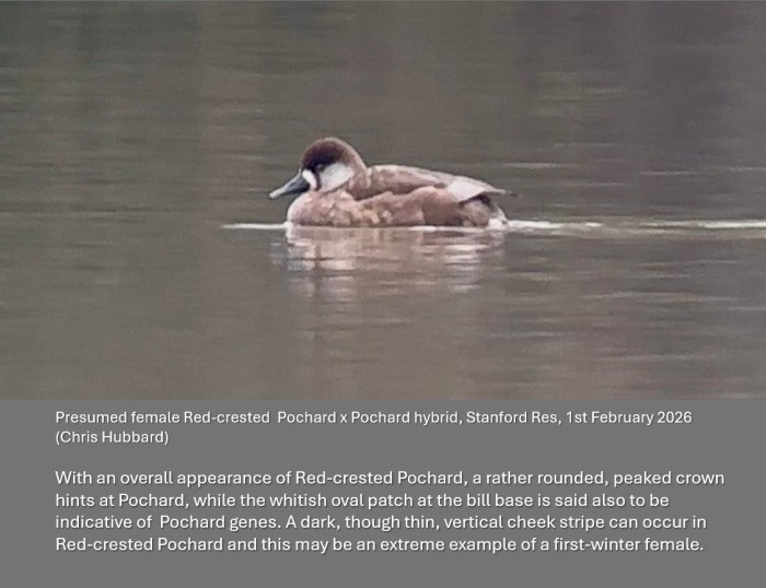 Ducks of note were limited to three species. Five Red-crested Pochards on 26th comprised a drake and a female at Billing GP and two drakes and a female at Deene Lake, while a drake and female Greater Scaup were found on separate lakes at Stanwick on 28th. We can’t rule out the possibility that the latter are the displaced duo from Thrapston, the same site having been previously vacated by the drake American Wigeon, which subsequently relocated downriver to Peterborough’s Ferry Meadows CP, where it was showing down to a ridiculously close 20 metres during its stay there between 24th and 27th.