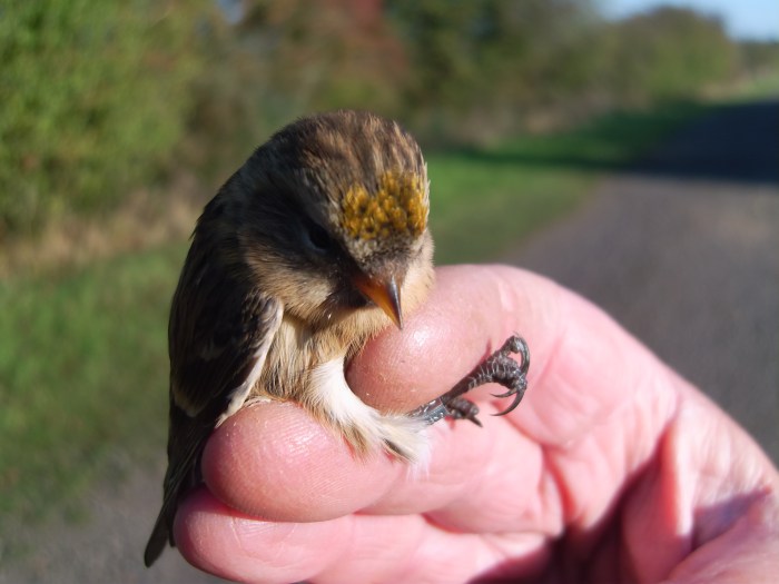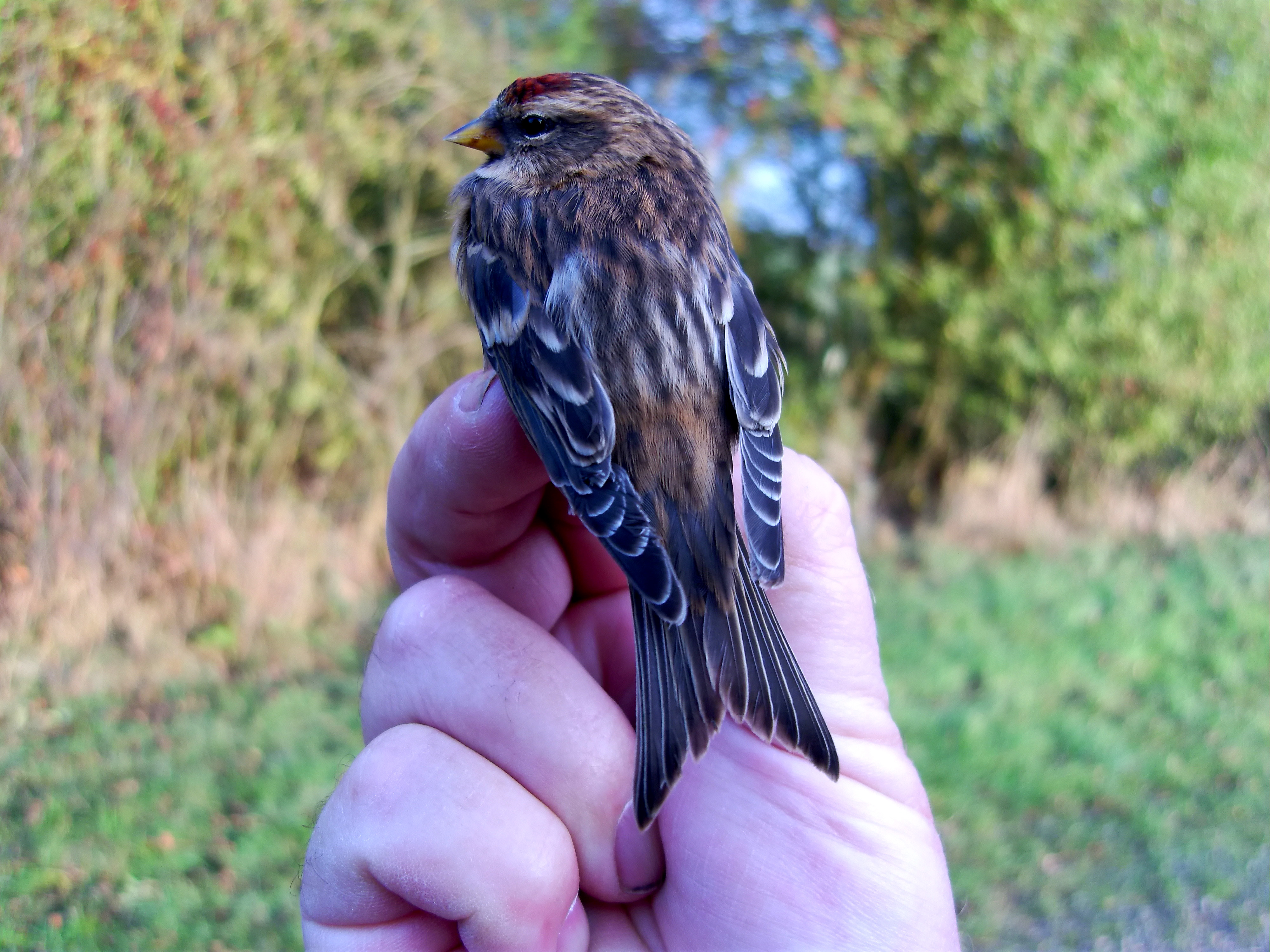 I spent this morning with the Stanford Ringing Group, which is currently enjoying a record year, having ringed more than 5000 birds since January! Ringing totals for most (not all) species have exceeded those of previous years making Stanford one of the top inland ringing sites in the UK. Among today’s list of trapped species were Redwing, Goldcrest, Blackcap, Reed Bunting, Linnet, Goldfinch and Greenfinch. During an apparent influx of migrants, double figures of the latter were trapped, each individual being 3-4 grams below the expected weight, indicating that they had burned off some of their fat reserves through migration. Of further interest, however, was the half a dozen Lesser Redpolls trapped, one of which was strikingly different to the others. This individual, a first-winter, had the red poll replaced by a gold one and this is the first time I have encountered a redpoll exhibiting this exceptional crown colour.