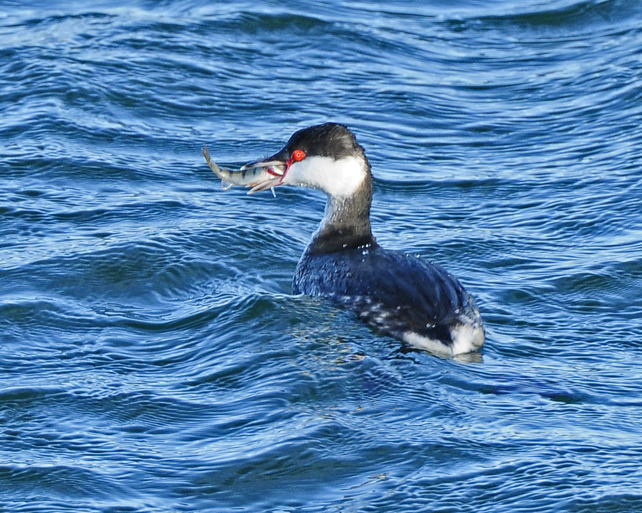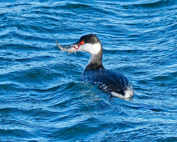 I don’t envy it having to contend with that über-sharp, spiky dorsal fin! Look at that super-bright, red orbital skin around the eye, a feature which it shares with Black-necked Grebe but which is lacking in winter-plumaged Red-necked Grebe.