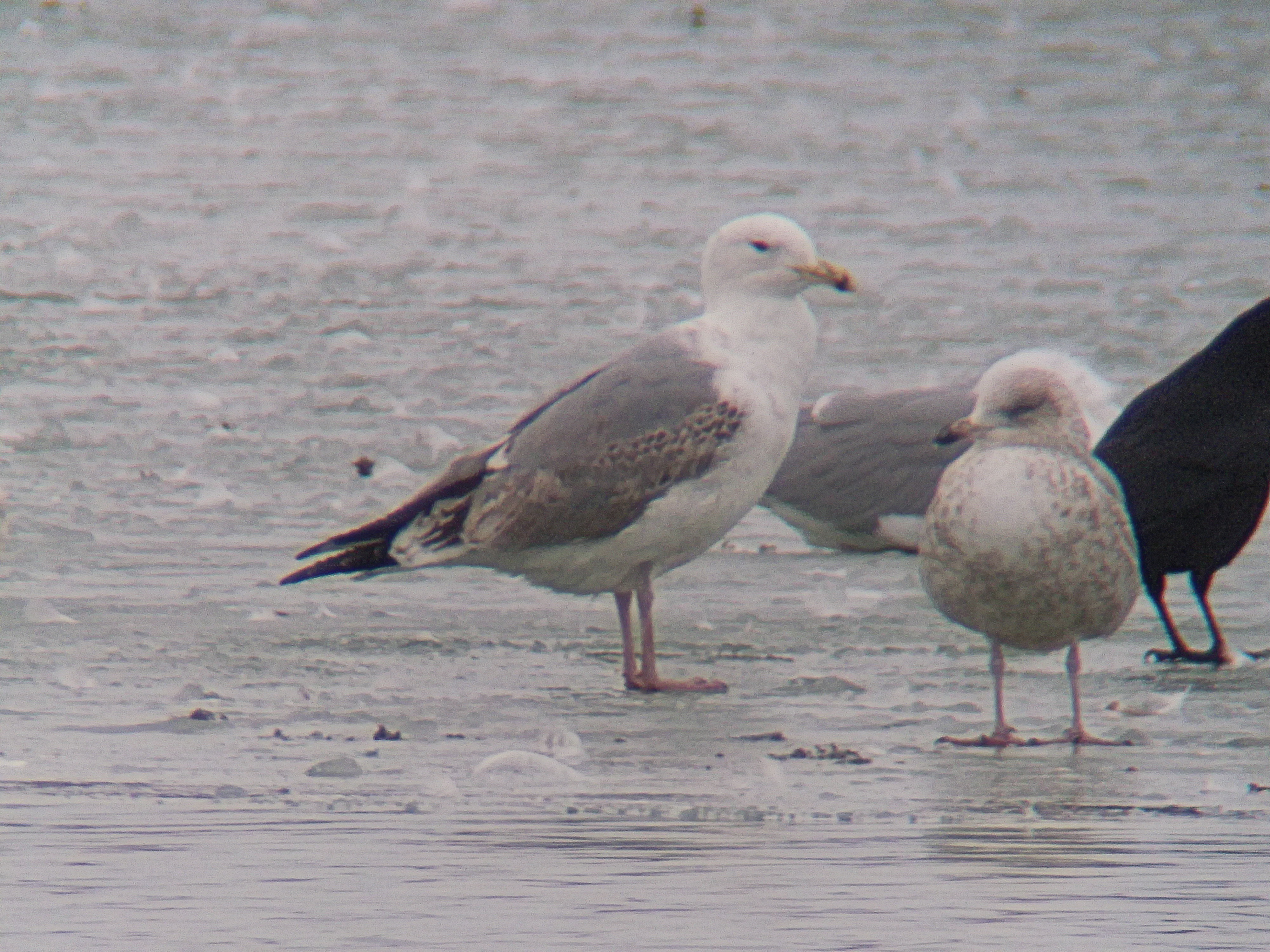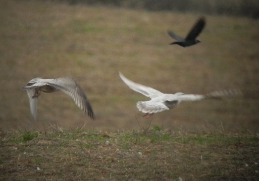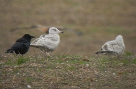 Interestingly there might have been a new Glaucous Gull there, too. Dave Warner’s photo, below, taken at nearby Sidegate Landfill on 28th January, appears to show a third-winter with an apparent patchy grey mantle and the dark subterminal band on the bill much reduced in comparison to those of the two ‘regular’ second-winters which have been visiting the site. But maybe long distance, light and camera have conspired to distort reality …
