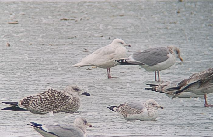 One of the Iceland Gulls was showing distantly on the ice when I was there on Wednesday. In this plumage it sticks out like a sore thumb among the many other large gulls and its small size and delicate proportions are obvious compared, for instance, to the nearby Herring Gull.