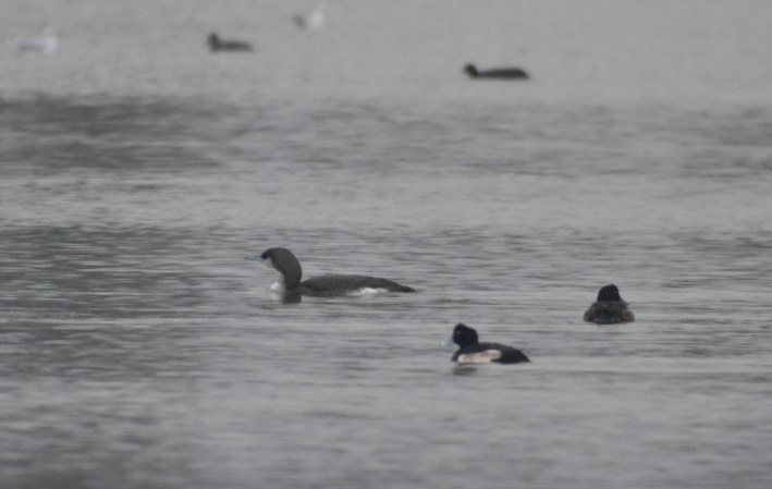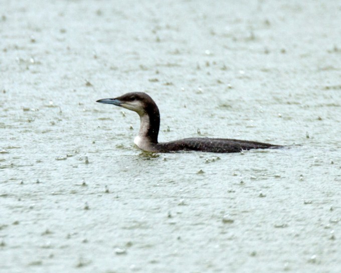 The white flank patch, visible just above the water, rules out Great Northern Diver (as does the relatively narrow bill, absence of both neck patches and bulging forehead) and vagrant Pacific Diver (as does the large bill and absence of chin strap or vent strap).