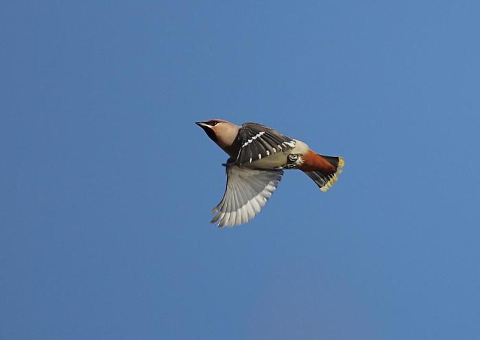After a small flock of up to eleven Waxwings was discovered visiting the Rowan trees in the car park at Homebase, Sixfields from 14th to 16th, another fourteen were found at nearby Sixfields Lake on the latter date and at least ten were still present there yesterday. Today, twenty-five have been present – though highly mobile – around the SixfieldsLake area, suggesting that the two flocks have now combined. Being flighty, they have not been easy to catch up with, giving many birders the run-around. Jonathan Philpot was fortunate in capturing the below images after most of us had given up this morning …