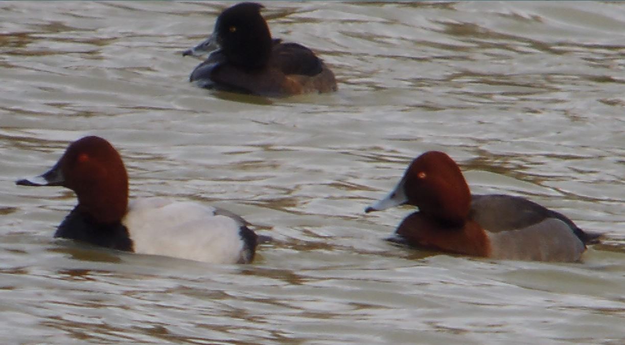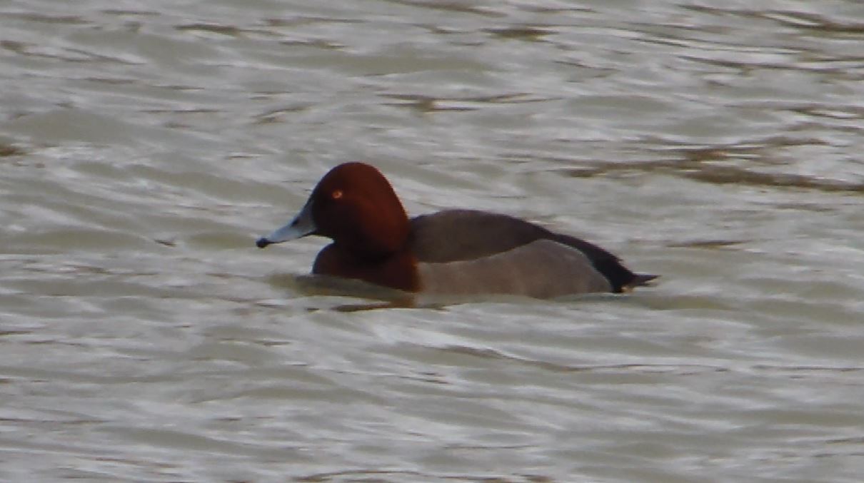 While searching for the female Scaup reported from Sixfields Lake at Stortons GP yesterday, I came across this interesting-looking duck. It was obvious among the Pochards on the lake by virtue of its overall darkness compared to ‘standard’ drake Pochard, to which it bore a passing resemblance.This individual exhibits characters associated with both Pochard and Ferruginous Duck. Approximately the same size and shape as Pochard, perhaps a fraction smaller. The head, neck and breast colours are close to, and are clearly ‘borrowed’ from, Ferruginous Duck, as is the head shape and, to some extent, the bill. The latter has a dirty wash across its basal third. The golden/orange eye colour is neither Pochard (= red) nor Ferruginous Duck (= creamy-white) and the white secondary bar and dirty white undertail coverts are also lent by Ferruginous Duck although they are not as extensive or as distinctive as in that species. The body and wings (apart from the secondaries) appear to be Pochard derivatives.