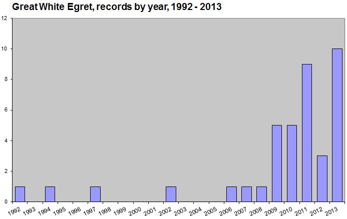 It seems likely that Great White Egrets will follow in the footsteps of Little Egret – at least to some degree – and they are therefore likely to become an increasingly regular sight at our local bodies of water during the winter months.