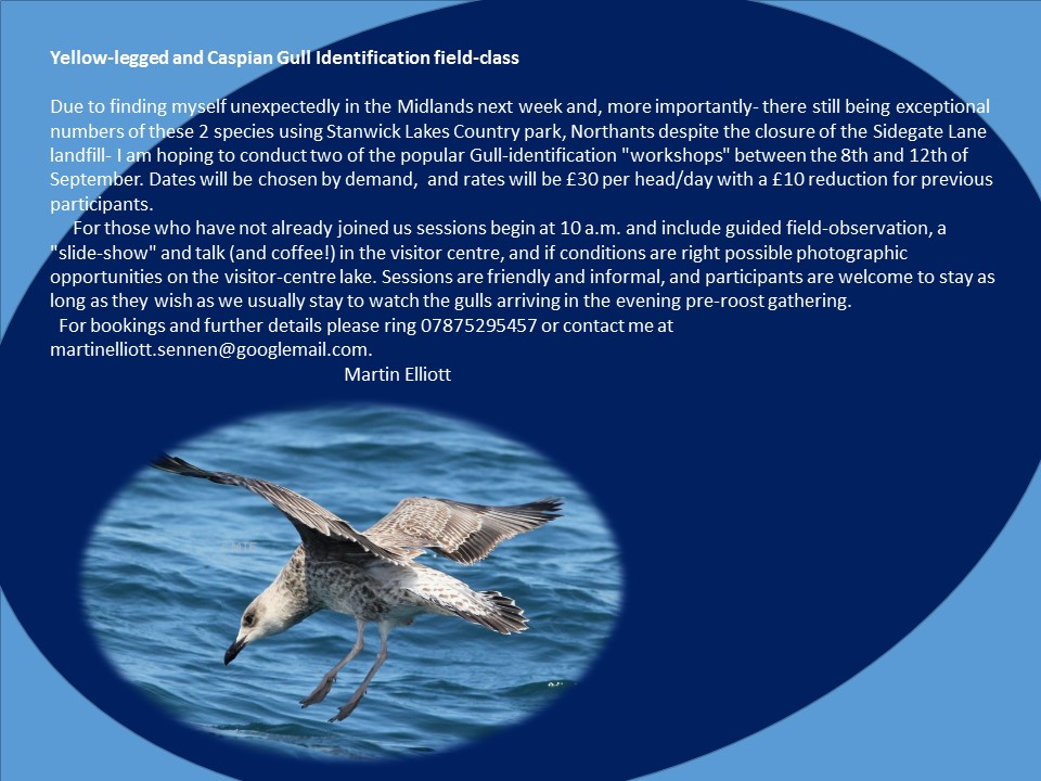 The latter site continued to host up to two adult Yellow-legged Gulls throughout the week as did Hollowell Res, while an adult and a first-winter visited nearby Ravensthorpe Res on 8th but Stanwick again claimed the lion’s share with approximately forty present there on 10th.