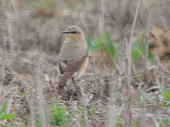 While I was trying to digiscope it through the heat-haze, another wheatear appeared nearby – this time a female. On switching attention to it, I noticed it was asymmetrically marked. The uppermost and lowest tertials of its left wing had broad whitish-buff fringes, indicating unmoulted winter/1st winter feathers, while the middle one was the ‘normal’ plain colour of a 1st summer/adult. Its right wing appeared to show a single, plain adult middle tertial with the lowest and highest ones seemingly absent.