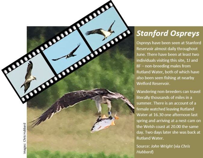 Ospreys were again fishing at Stanford Res on 16th and 18th and one wandering individual visited Summer Leys, appearing over the scrape there on 17th.
