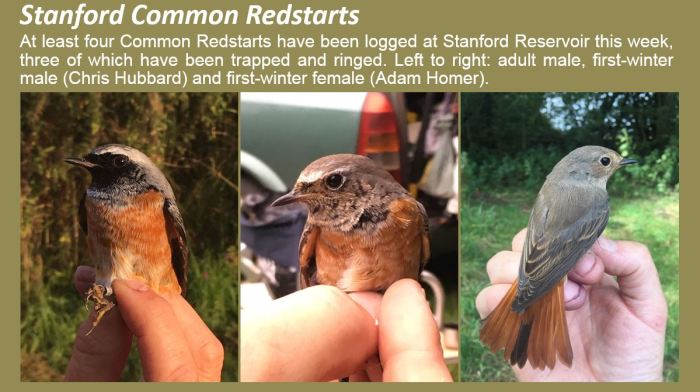 Stanford Res enjoyed a run of Common Redstarts, with two trapped and ringed on 26th, another trapped and ringed on 28th, followed by one there on 29th. Singles were also seen at Borough Hill on 26th and at Fawsley Park the following day, while two were found in a hedgerow near Twywell on 1st.