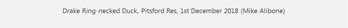 Also apparently rooted were the Pink-footed Goose and the six White-fronted Geese at Stanwick GP and Red-crested Pochard numbers bounced back to sixteen at Pitsford Res on 17th and 21st and 17th also saw two at Thrapston GP, while the lone drake was still at Hollowell Res and a female visited Ditchford GP – both on 16th. On the latter date a first-winter Scaup was at Pitsford Res and the first-winter or hybrid was still at Ditchford GP before relocating next door to Stanwick the following day and the first-winter remained all week at Thrapston GP. Back at Pitsford, the drake Ring-necked Duck remained until at least 20th and the drake Smew reappeared on 19th, followed by a ‘redhead’ there the next day.