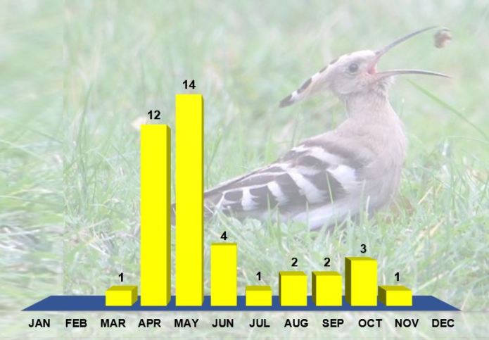 Hoopoe, Ditchford GP, 19th May 2019 (Trev Earl)Hoopoe, Ditchford GP, 19th May 2019 (Trev Earl)Hoopoe, Ditchford GP, 19th May 2019 (Trev Earl)Hoopoe: Monthly distribution of records, 50 years, 1969-2018. (Background image Bob Bullock).