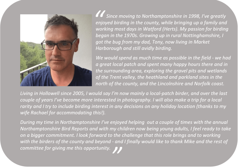 Having been without since 31st March 2017, Northamptonshire now has a new County Recorder. Stepping into the breach and already well known to many local birders, Jonathan Cook will take on this important role with immediate effect. This is, of course, great news and Jonathan will be warmly welcomed by local and national bodies alike. Jon is, to use his own words, ‘raring to go’ …