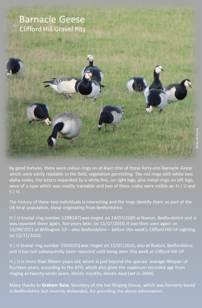 Continuing to elicit some interest, the Barnacle Goose flock, still present at Clifford Hill GP into this week, had significantly reduced to twenty by 21st and they remained there until the week’s end.