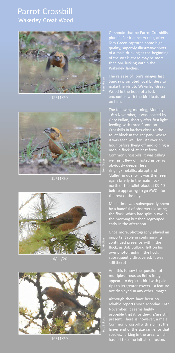 Last week’s male Parrot Crossbill continued to elude, evade and generally played hard to get, being seen only briefly on 21st at Wakerley Great Wood, which continued to host Crossbills, clearly on the up this week, with at least sixty-one being present there on 27th. Up to nine were still being seen at Hollowell during the period, eight were still in Bucknell Wood on 22nd and singles flew over both Stanwick GP and Pitsford on 24th.
