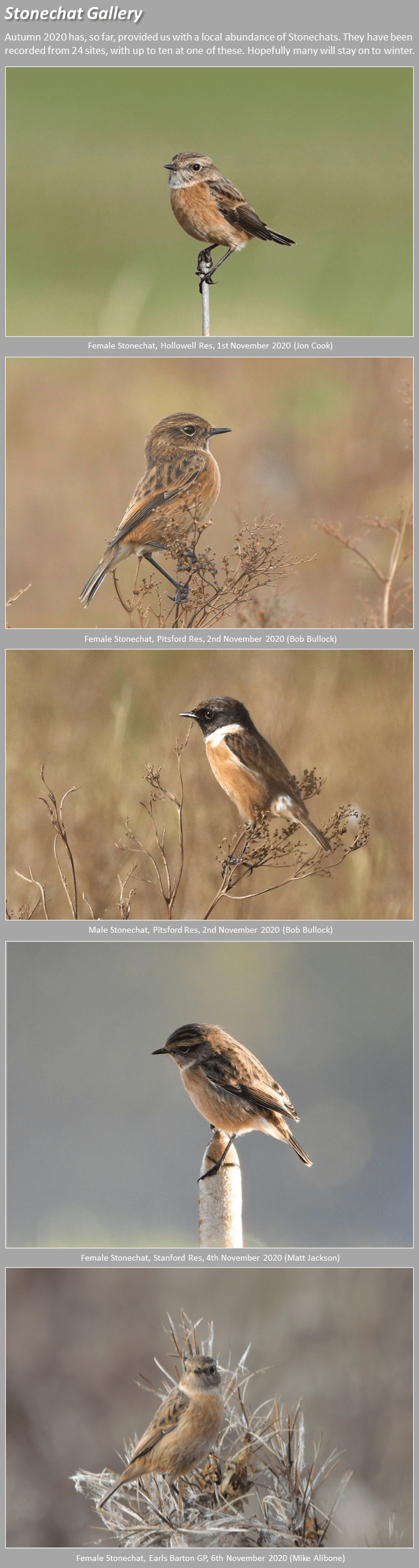 Wintering Stonechats were recorded from DIRFT 3, Hollowell, Lilbourne Meadows LNR, Pitsford, Stanford and Thrapston, with no more than four at any one site.