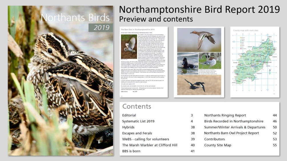 As always, the 2019 report will be available by post from R W Bullock, 81 Cavendish Drive, Northampton NN3 3HL at a price of £9.00 each, including postage. Cheques should be made payable to ‘Northamptonshire Bird Report’. Back issues from the ‘early seventies’ are also available.