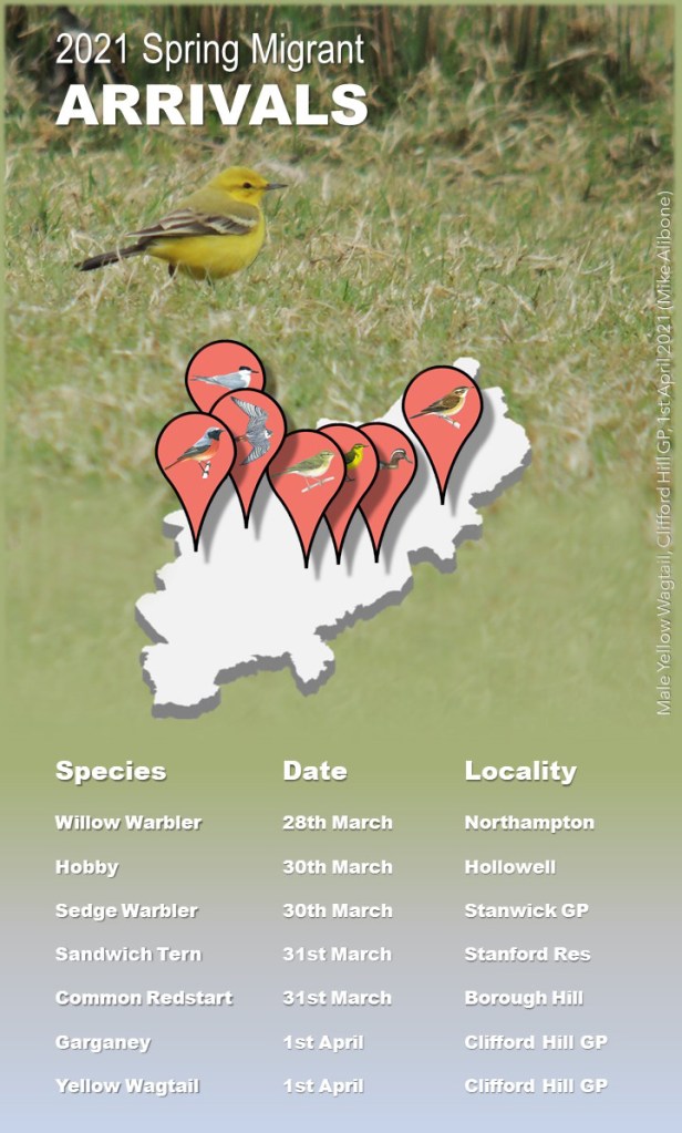 Another first for the year materialised in the form of a Common Swift over Stanwick on 23rd, followed by two more at Kislingbury later in the day. What no-one was prepared for, however, was a little less tangible: a European Bee-eater flew west over Summer Leys on 17th, calling three times. Frustratingly for the two birders tuned in to it, it remained invisible, high up in the clear blue of the troposphere. If accepted, it becomes the fifth county record. Others were found in Cornwall and Scilly during the previous week.