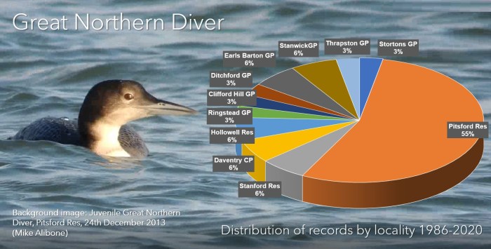 Kicking off the week, although two months later than the peak for arrivals, a Great Northern Diver was found at Pitsford, late on 23rd. It remained throughout and if you’ve got it in mind to find one, Pitsford’s the place, accounting for more than half of all the county’s records in the last 35 years, and November’s normally the month, producing 48% of the records during the same period, followed by December with 33%.