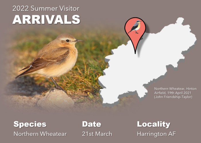 Passerines continued to feature poorly, with Borough Hill’s Black Redstart resurfacing on 23rd and still being present at the week’s end. That is, of course, assuming it has remained there since it was last reported on 5th February … or could this be a new bird? The only other passerine of note was Northern Wheatear, the first of the spring being the aforementioned Harrington bird on 21st, followed by another behind Mary’s Lake at Earls Barton GP two days later, on 23rd.