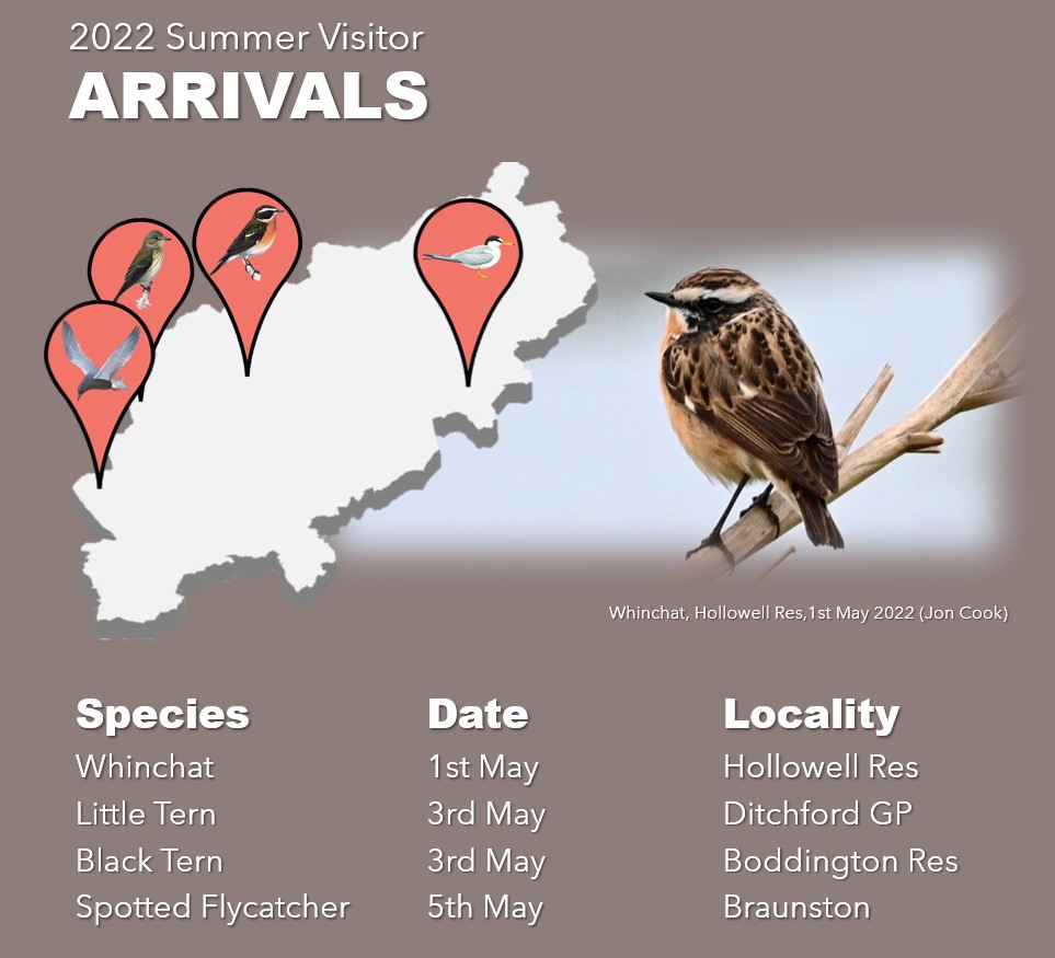 The year’s first Whinchats pitched up, perhaps a tad later than expected, starting with a male at Hollowell Res on 1st-2nd, swiftly followed by further birds at both Elkington and Priors Hall, Corby on 2nd and, on 5th, twos at Clifford Hill GP and Stanford Res and one in the Brampton Valley below Hanging Houghton.