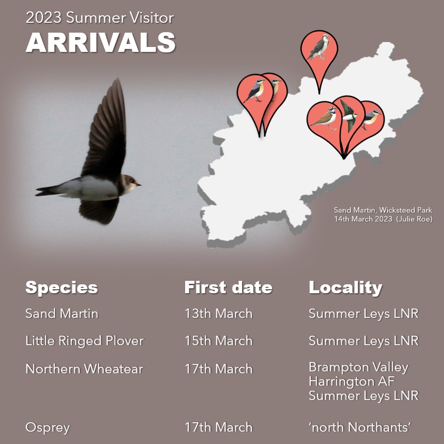 Hot on the heels of the first spring wave last week, Northern Wheatears were on the up with five together at Willowbrook Industrial Estate, Corby on 23rd, twos at Polebrook AF on 19th and in the Brampton Valley on 20th, plus singles at the latter locality on 21st, 22nd and 24th and one at Hinton AF on 18th.