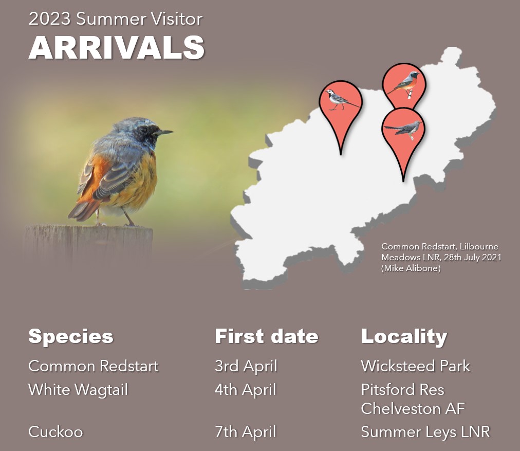 While none of the above is an early record-breaker, the Common Redstart – another of which was found at Burton Latimer on 7th – misses out by only three days and the Cuckoo by five. Further White Wagtails (two males) were seen at DIRFT 3 on 6th.