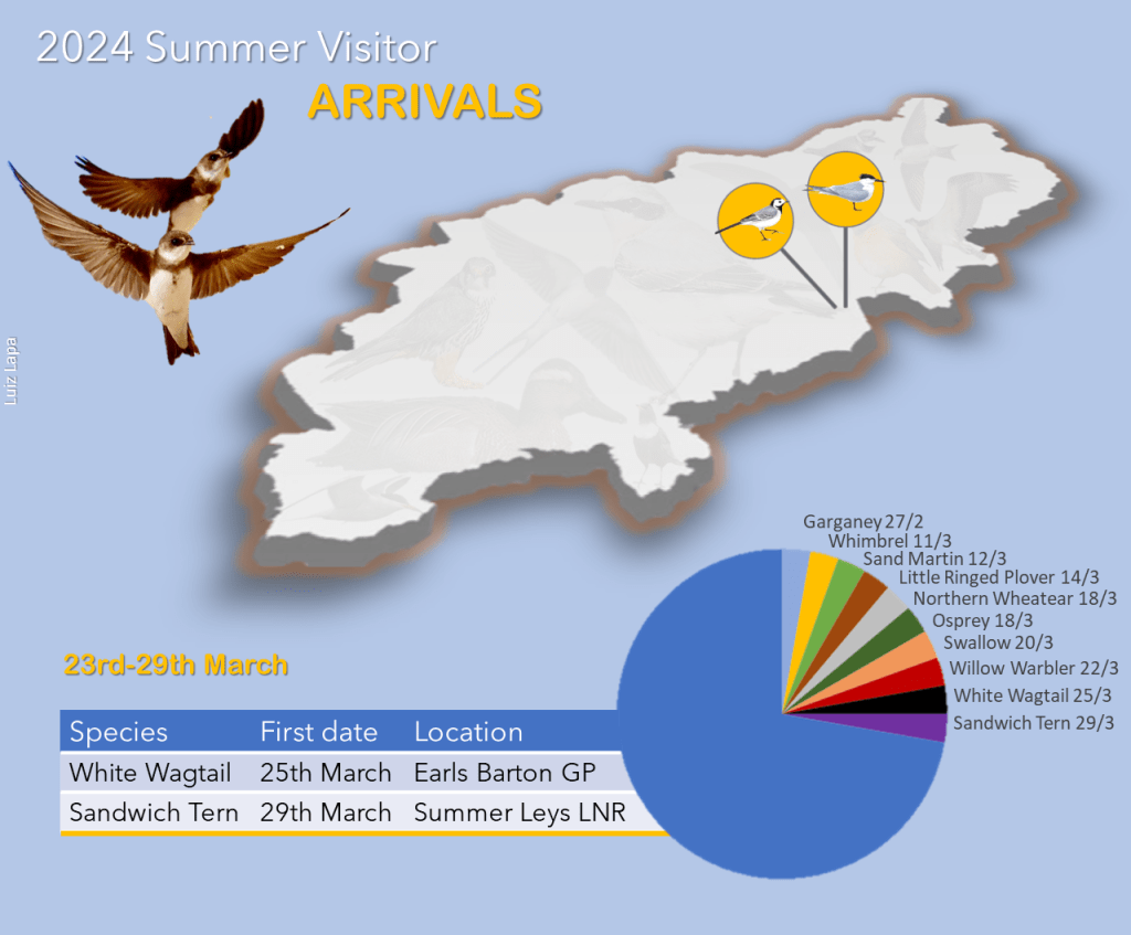 Completing the week’s new summer arrivals, rather more standard fare turned up in the shape of a White Wagtail at Earls Barton GP on 25th-26th, quickly followed by another at Pitsford Res on 27th.
