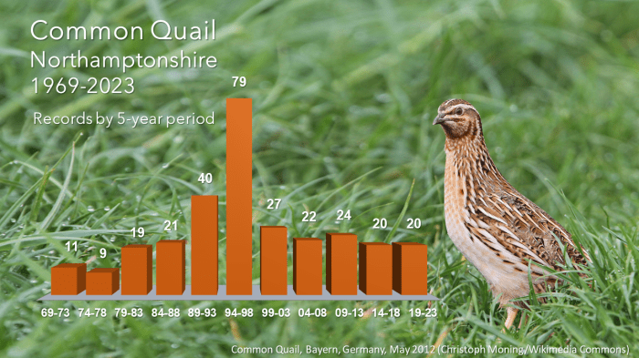 Following last week’s call for a Common Quail in the county, and after the suggestion that there may potentially be a long wait in the offing, as if by magic, three came along at once. Unlike buses, though, they were not easy to catch up with, or so it seems. On the evening of 25th, two males were singing north of Walgrave with one reportedly still present the following evening and two again on 28th. Meanwhile, another was discovered singing less than 5 km to the north-west, at Harrington AF, also on 26th.