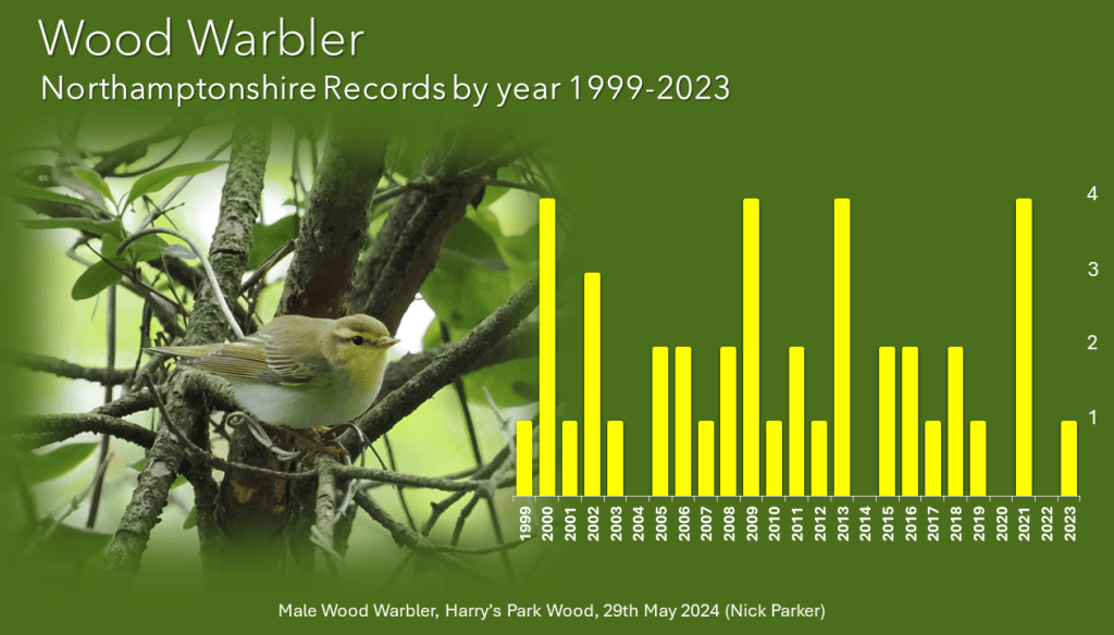 Following the popular 2022 juvenile at Duston, this is only the fifteenth record for the county since 1971. In some respects, the occurrence of this week’s bird is not really out of context, given the phenomenal numbers recorded in the UK during late spring. The overwhelming majority were along the east coast, from Kent to Shetland, with more than 350 being recorded during the last ten days of May alone.