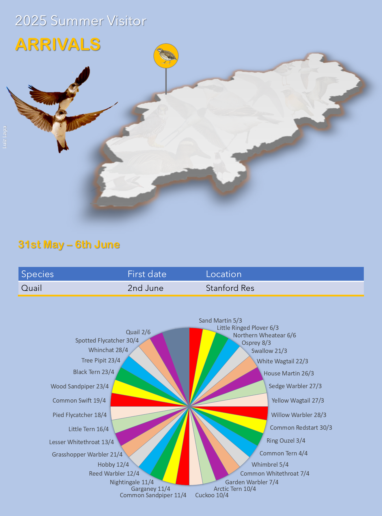 Another warm week, kicking off with the hottest day of the year so far, during which national temperatures exceeded 33°C and a shade under 29°C locally. While this was backed by a largely westerly airflow throughout the period, there was a hint of a southerly movement underway for some species …