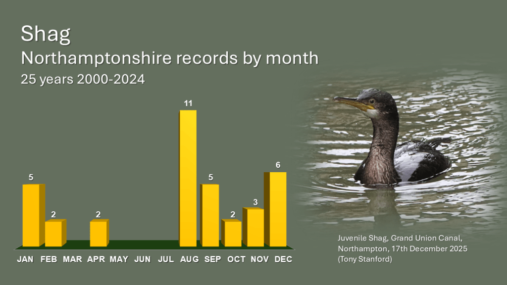 Now on to the bird of the week and there’s nothing like a festive Shag, with December having been proven to be the second most popular month for occurrences in the county over the last 25 years. Found on 17th in the somewhat bizarre location of the Grand Union Canal, up close to the busy A43/M1 junction 15A, it represents the only one of its kind for 2025 and, after apparently going missing the following day, there it was again, still on the canal, some 1.8 km further north on 19th. While the vast majority of Shags have expectedly turned up at well-watched, sizeable bodies of water in rural settings, some are occasionally found ‘wrecked’ in areas far removed from water and others occasionally buck the trend, appearing in urban localities. One that turned up at the unlikely location of Abington Park Lakes, Northampton in mid-December 2006 is a prime example. It stayed until February 2007 and was seen by many local birders. Shocking to think that was nearly 20 years ago. Tempus fugit, as they say …