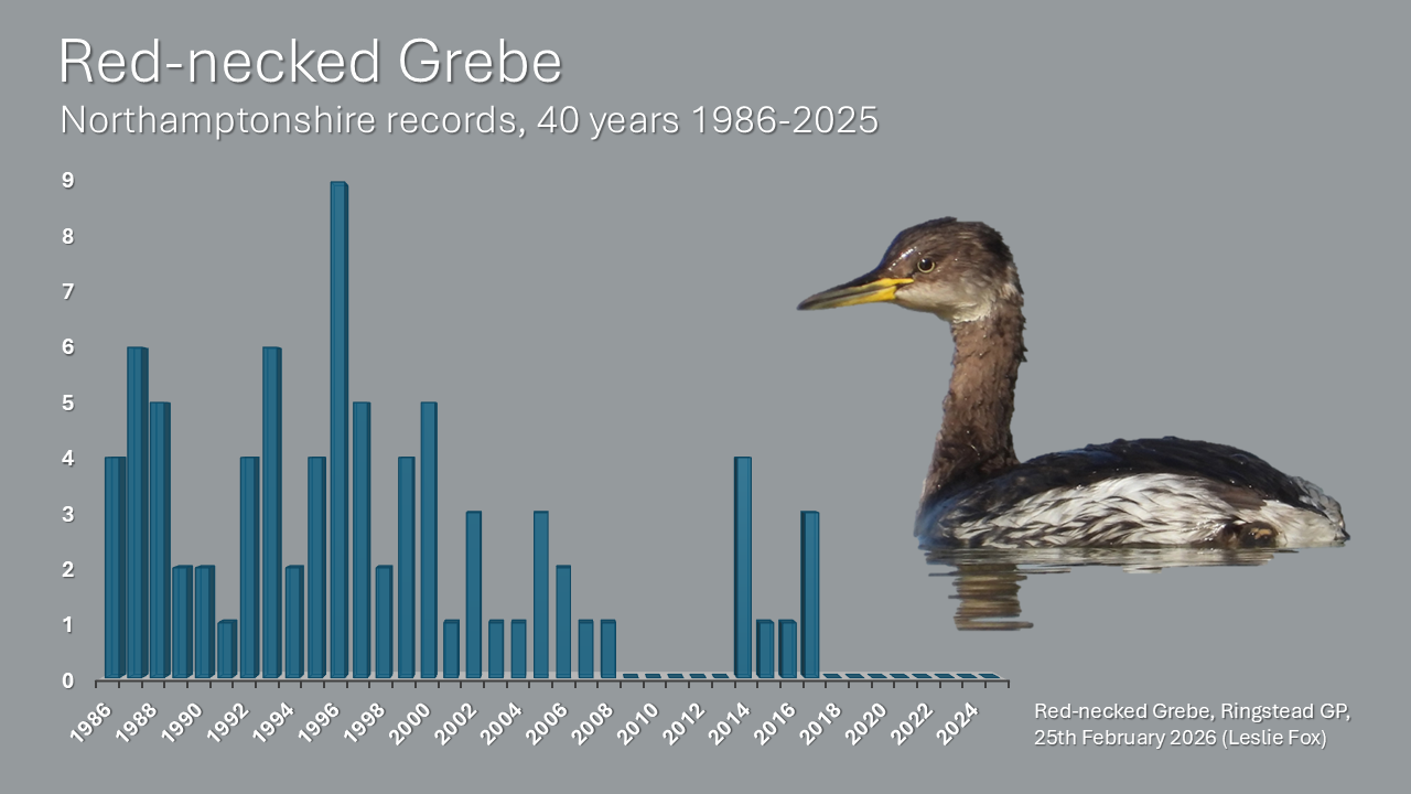 Following six in the county last year, including one as late as 27th December, the first Common Crane of 2026 was picked up in flight as it moved high north over Thrapston GP’s Titchmarsh NR on 23rd. The wait goes on for one on the ground …