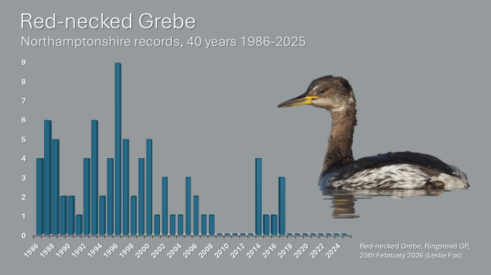 After last week’s Slavonian Grebe visiting Daventry CP on 19th, before moving on to Ravensthorpe Res the following day, it, or another, was found, or reappeared, at the latter locality on 26th but was not seen the following day. The 25th saw two Black-necked Grebes turn up at Daventry but, in common with the above bird, they had moved on by the next day.