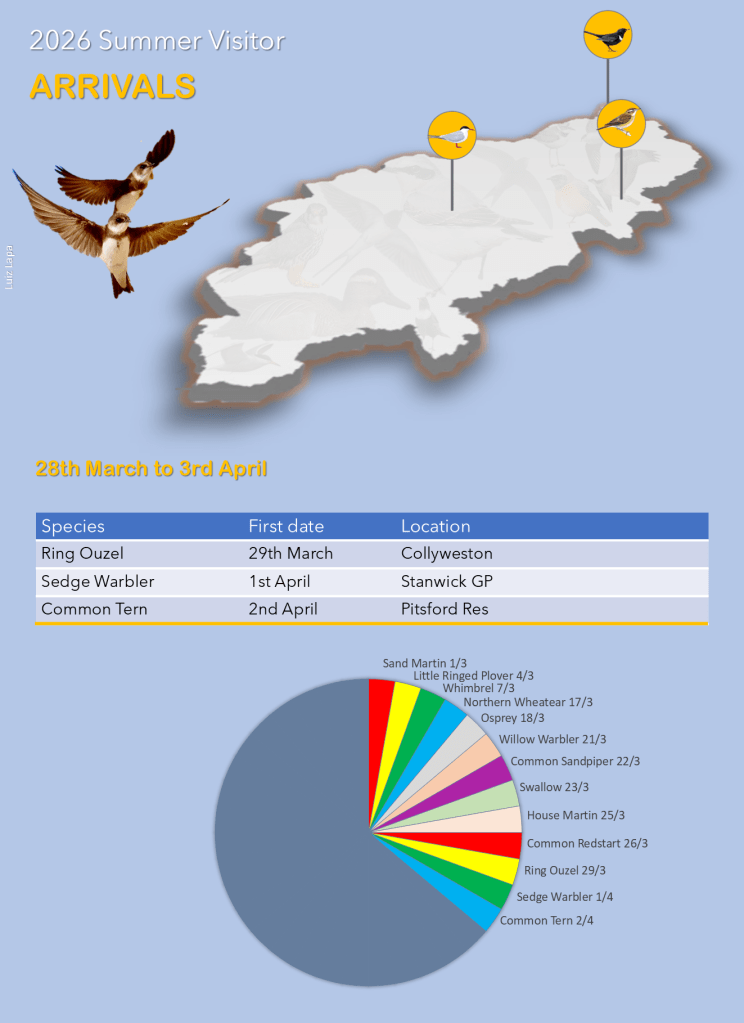 And, in addition to the aforementioned Ring Ouzel at Collyweston on 29th, another was found at Harrington AF on 1st. The second Common Redstart of the year appeared at Sywell CP on 31st and more Northern Wheatears were seen at Clifford Hill GP, where two were present between 28th and 30th, at Brixworth CP on 31st, Summer Leys on 1st, Harrington AF with two on 1st-2nd, and at Borough Hill where there were three on 3rd.