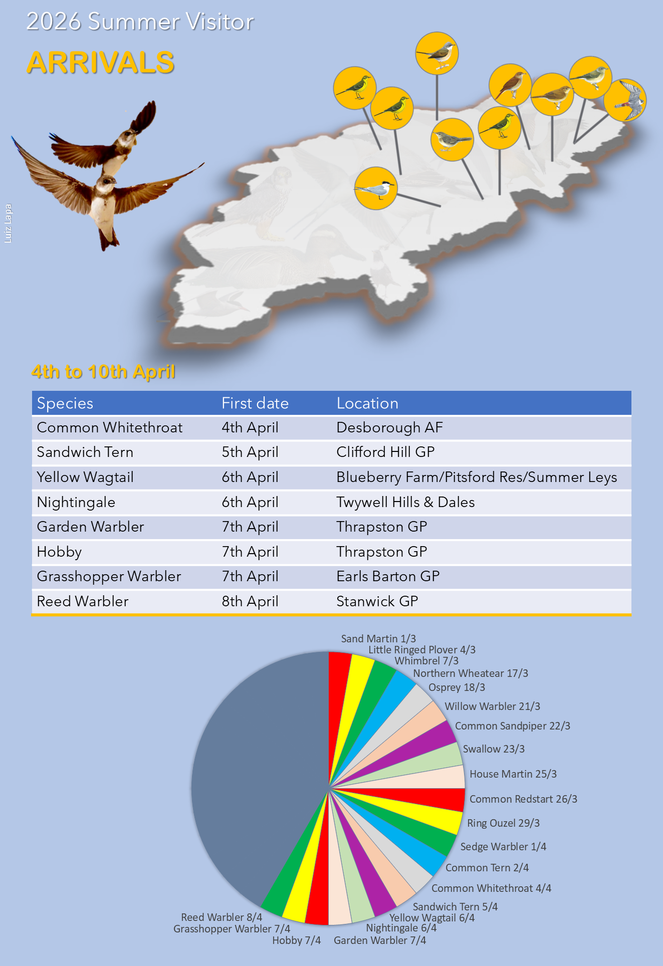 The second Whimbrel of the year paid a brief, early morning visit to Earls Barton GP (NWS) on 9th, the same site also having produced a Black-tailed Godwit on 5th. Another of the latter species visited Summer Leys LNR on 7th and the same two sites held single Ruffs on 9th and 10th, respectively. Adding to the 2026 wader tally was a Greenshank, also at Summer Leys on 10th.