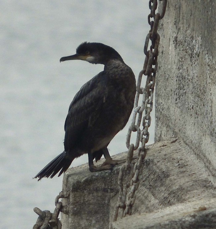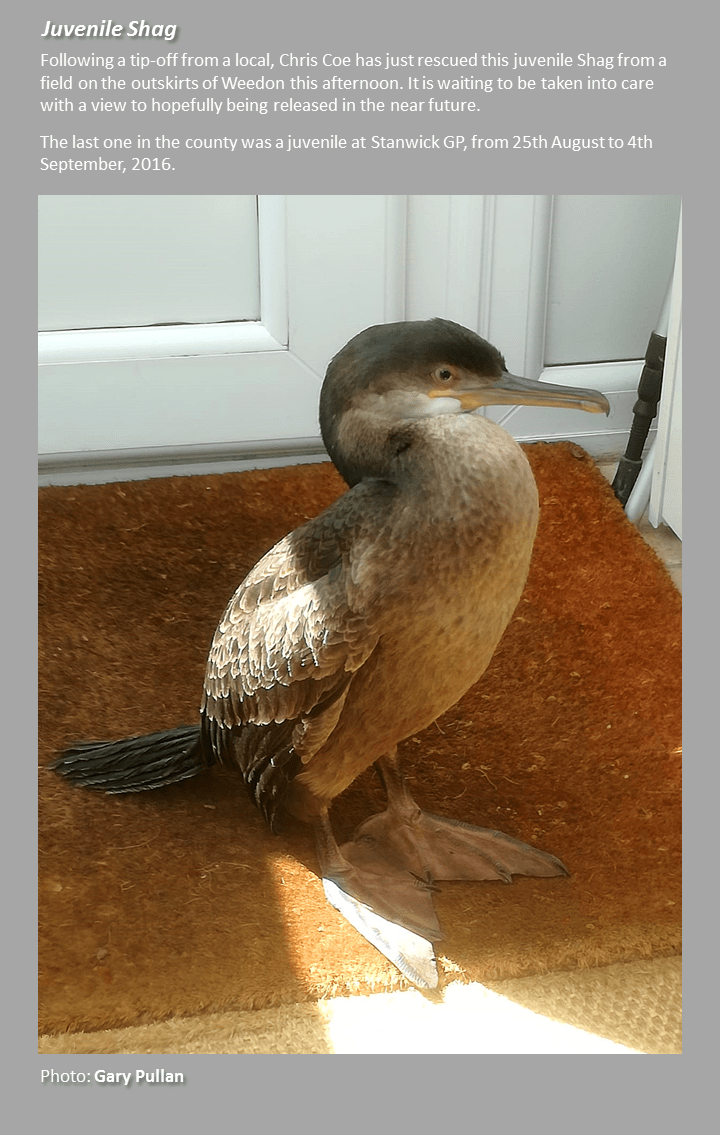 Yesterday, in the early evening murk, Neil McMahon found a juvenile Shag on the valve tower off the dam at Pitsford Reservoir. This is, so far, the only record in Northants this year. Shag is virtually an annual visitor to the County. The vast majority are juveniles and most occur during autumn and winter. Sometimes there are multiple arrivals and ten at Pitsford in autumn 1996 was noteworthy. In the last two weeks Shags have also visited Oxfordshire, Staffordshire and Warwickshire. Probably the most ‘famous’ Shag in recent years was the long-staying and approachable individual at the unlikely location of Abington Park Lake, Northampton, between December 2006 and February 2007. The Pitsford bird was still present this morning. Here is the best of a bad bunch of photos I took in poor light at around 07.30.