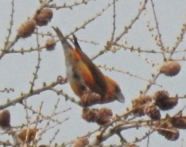 So, with history repeating itself during the past 24 hours, Wakerley has turned up trumps again, producing another Parrot Crossbill in the area of larches which surround the car park and routinely favoured by Crossbills.