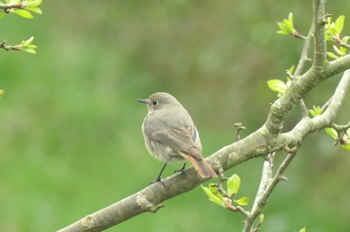 For one lucky person at least, ‘lockdown’ birding has delivered! At home in Spratton, David Arden was fortunate in having a Black Redstart visit his garden this afternoon. His excellent photos depict a very worn and faded bird, which appears likely to be a first-year female, based on appearance and feather wear. It has renewed a tertial on its right wing, the outer whitish edge of which would ordinarily contribute to the white patch on the closed wing, much abraded in this bird.