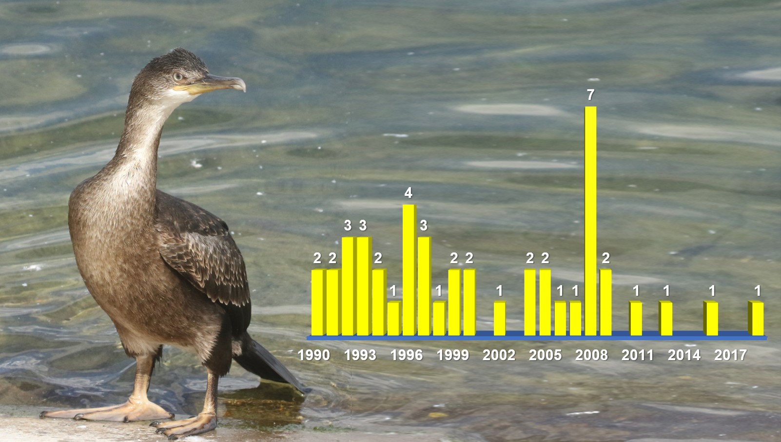 Shag: distribution by year of Northamptonshire records over 30 years, 1990-2019. Image of juvenile at Pitsford Res, 24th August 2020 (Bob Bullock)